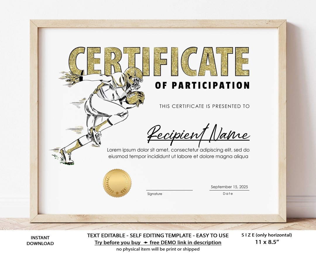 American Football Certificate Template Sports Certificate Award EDITABLE Printable Football Award Certificate Gold Digital Download Jet161 Etsy UK