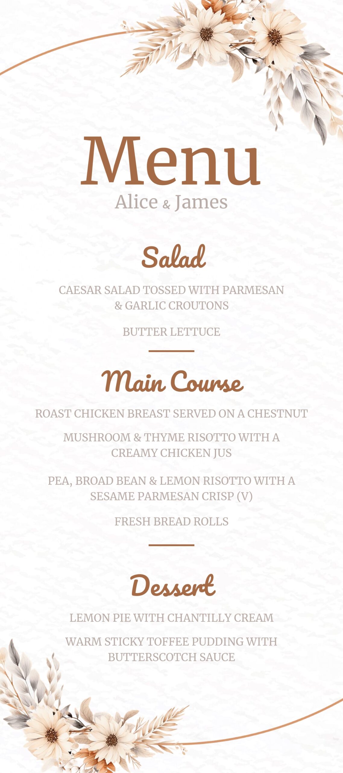Whether you’re having a rustic outdoor wedding or a glamorous ballroom affair, our template is versatile and can be customized to suit any style. Simply download the template, edit the text with your menu items, and print as many copies as you need.