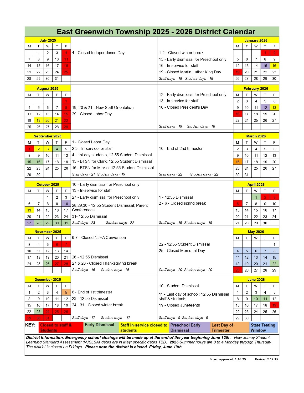 East Greenwich Township School District Calendar 25 26 Revised PDF EduCounty